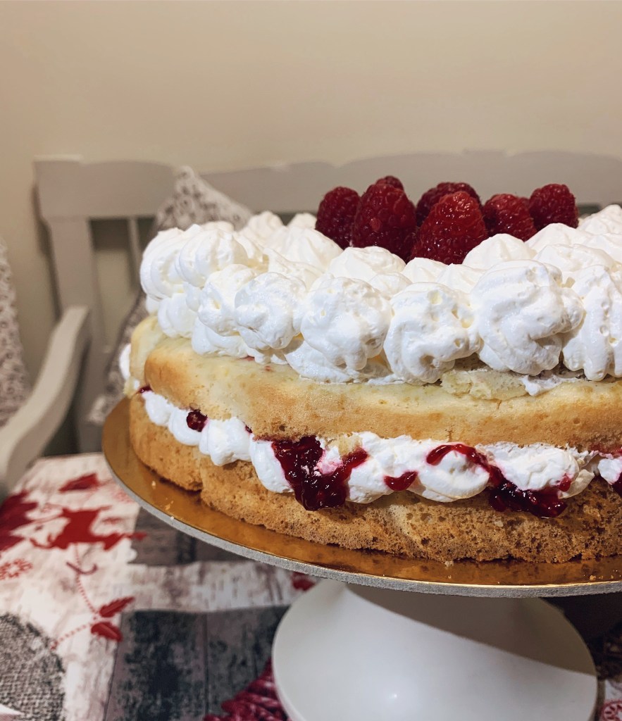 Victoria Sandwich ai lamponi. Ho sostituito l’impasto tradizionale della sponge cake con uno senza burro che resta più soffice e umido (oltre che un po’ light, se di light si può parlare vista la generosa dose di panna). Potete ripeterla con la vostra frutta e marmellata preferita…sapete che dopotutto io ho un debole per i lamponi.