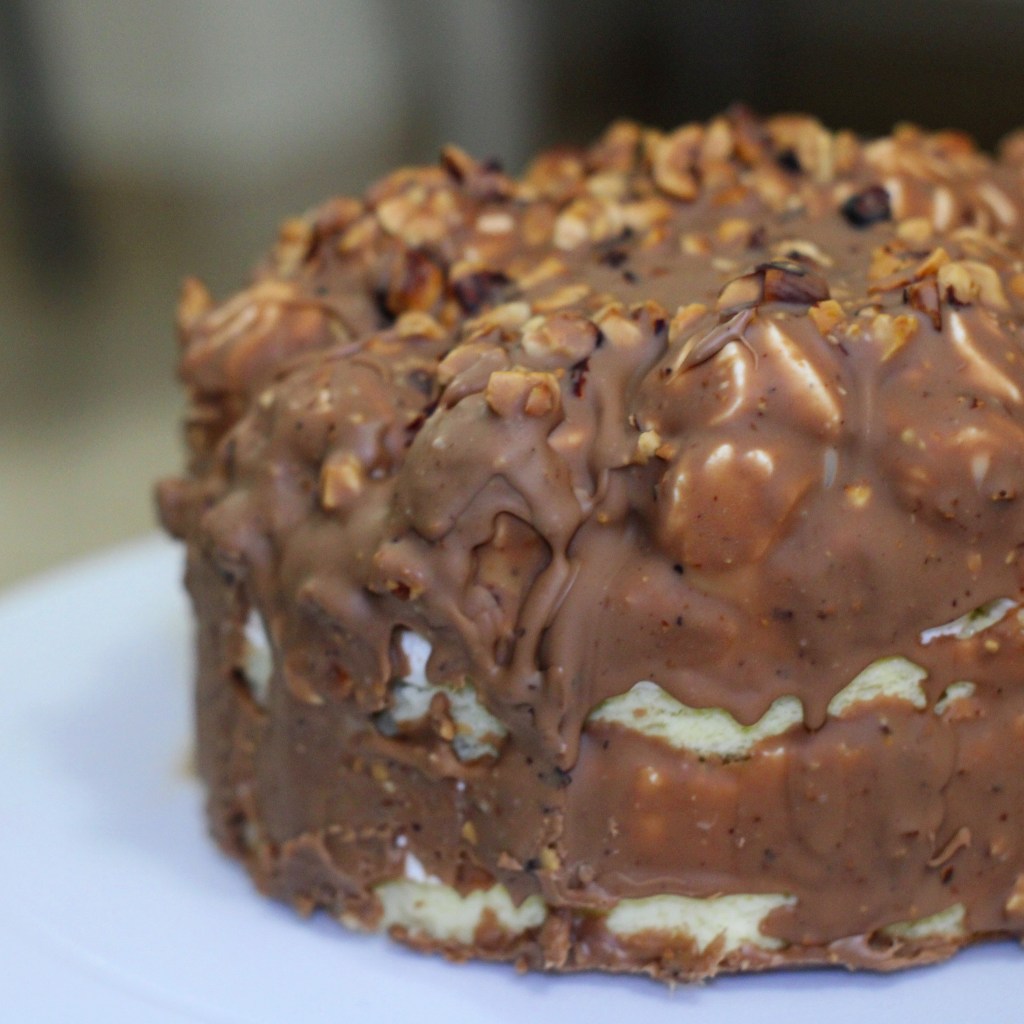 Questa è la torta creata per il compleanno del babbo. È formata da due strati di biscuit all’arancia, due strati di crema leggera alla vaniglia, uno strato di pralinato alla nocciola e una golosissima e croccante glassa rocher. È la prima volta che glasso una cake e per fortuna non è andato nulla storto.
