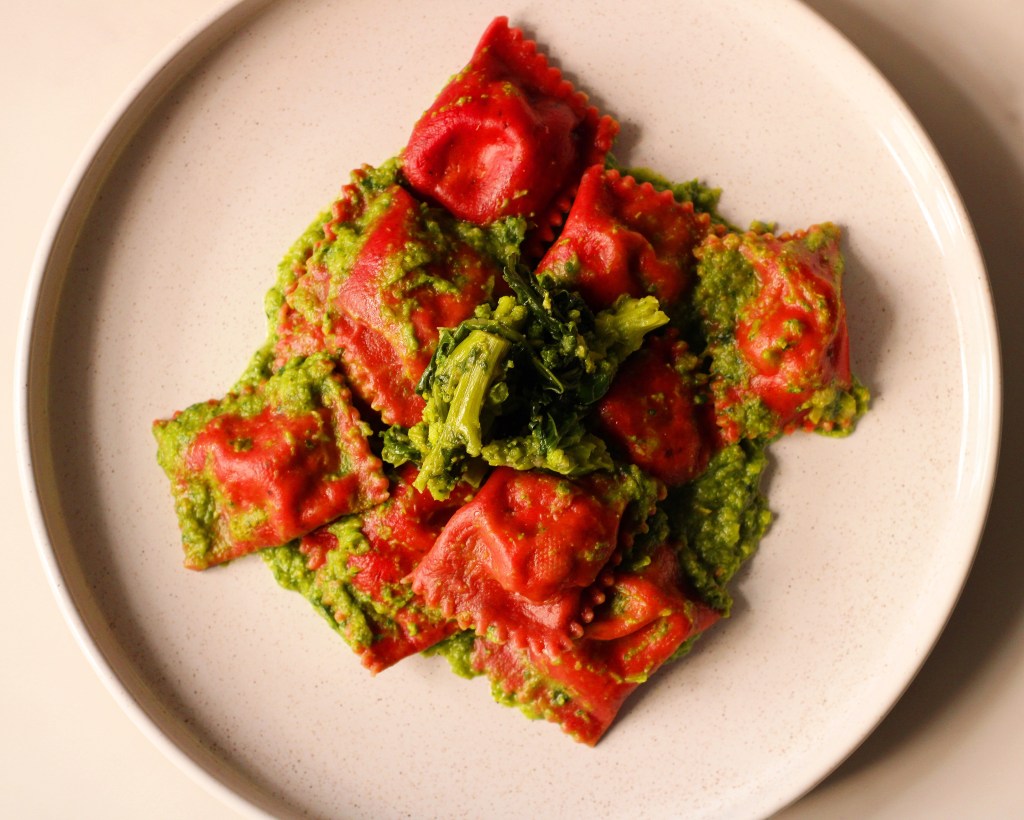 Mi sono daccapo cimentato con la pasta fresca e questa volta ho preparato i ravioli. Li volevo colorati e ho fatto un impasto alla rapa rossa. Per il ripieno ho cercato un contrasto netto e mi sono affidato al caprino, unendo la mandorla per dare la nota croccante che a me piace sempre molto. Il contrasto l’ho anche cercato con il condimento preparando una crema a base di cime di rapa. L’effetto cromatico è soddisfacente tanto quanto la bontà di questo piatto.