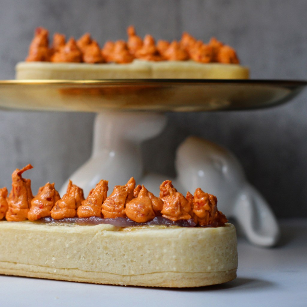 Questa buonissima crostatina si può presentare esteticamente come un dolce ma in realtà racchiude una crema pasticciera salata e un dolce e morbido confit di cipolla rossa che ben si sposa con il sapido del frosting ai pomodori secchi. Insomma un’idea davvero sfiziosa per coccolare i nostri aperitivi.